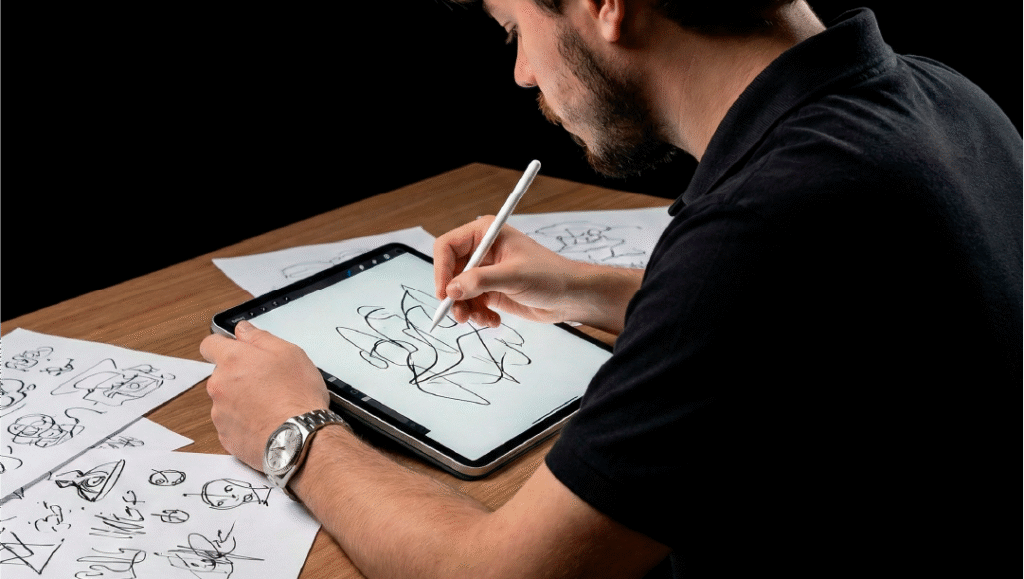 Todo projeto nasce de uma necessidade de negócio. Nesta etapa, mergulhamos no seu universo: analisamos o público-alvo, a concorrência e os objetivos comerciais. Seja para um novo site ou um material impresso, o foco é entender o que o design precisa vender. Definimos aqui a “espinha dorsal” que guiará todas as decisões criativas.